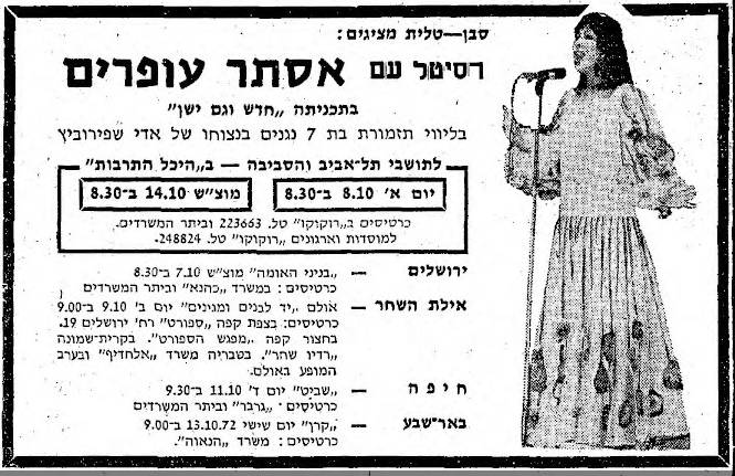 In October 1972 Esther gave concerts in Tel Aviv, Jerusalem, Ayelet HaShahar, Haifa and in Be'er Sheva.